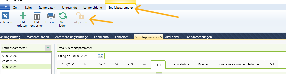 Wenn das Kind eingepflegt wurde und dann aber die Kinderzulagen nicht ausgewählt werden können, sind unter den Betriebsparametern keine zum Jahr passenden Daten vorhanden. Falls die Parameter nicht bearbeitet werden können, müssen sie entsperrt werden. Achtung, das rückwirkende Ändern des Betriebsparameters ist nicht empfohlen, falls schon Buchungen im aktuellen Jahr vorhanden sind.